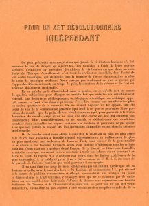 1 f. 4° de 4 p., impression en noir sur papier orange. Edit. orig. de ce manifeste écrit en collaboration avec Léon Trotsky que Breton avait rencontré au début de l'été 1938 chez Diego Rivera. Il se termine par ce slogan "Ce que nous voulons : l'indépendance de l'art - pour la révolution ; la révolution : pour la libération définitive de l'art", qui devint le signe de ralliement de la Fédération internationale de l'Art révolutionnaire indépendant" (F.I.A.R.I.) créée par Breton après son retour en France (J. Pierre, Tracts surréalistes, t. 1).