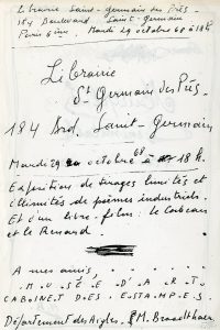 Feuillet annonçant l'"Exposition de tirages limités et illimités de poèmes industriels et d'un livre-film : Le Corbeau et le Renard" à la librairie Saint-Germain des Prés le mardi 29 octobre 68. 1 f. de 20,5 x 14 cm imprimé en noir recto/verso.