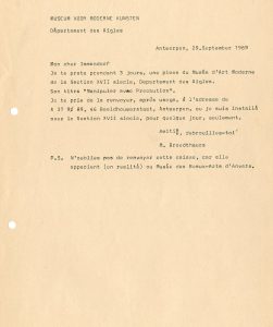 BROODTHAERS (Marcel).Lettre ouverte à en-tête du "Museum voor Moderne Kunsten. Département des Aigles", située et datée "Antwerpen, 29. septembre 1969"