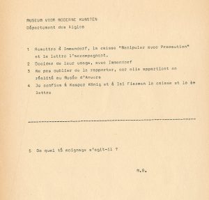 BROODTHAERS (Marcel).Lettre ouverte à en-tête du "Museum voor Moderne Kunsten. Département des Aigles" (non datée) : "1. Remettre à Immendorf, la caisse Manipuler avec Précaution. 2. Décider de leur usage, avec Immendorf. 3. (...).".