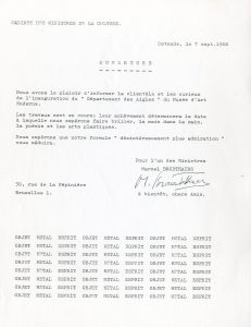BROODTHAERS (Marcel).Lettre ouverte, à en-tête du "Cabinet des Ministres de la Culture", située et datée "Ostende, le 7 sept. 1968" : "Ouverture.