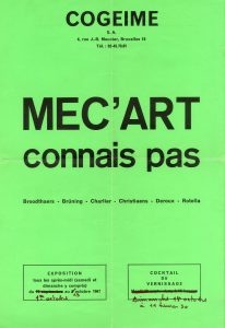 Exposition collective à la galerie Cogeime à Bruxelles : Broodthaers, Brüning, Charlier, Christiaens, Deroux et Rotella. Rectification manuscrite des horaires d'exposition. Dim. : 45 x 30 cm (affiche pliée). Le Mec'Art (Mechanical Art) désigne un courant artistique apparu en 1963 en Europe et regroupant des artistes tels que Gianni Bertini, Alain Jacquet, Mimmo Rotella, Gerhard Richter ou encore Polke.