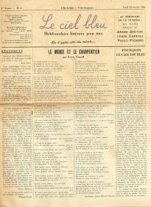 Hebdomadaire littéraire pour tous. Brux., du 22 février au 19 avril 1945, 9 fasc. de 37,5 x 27,5 cm, de 4 pp. chacun. Hebdomaire dont la rédaction était assumée par Paul Collinet, Christian Dotremont et Marcel Mariën. Au sommaire : des poèmes, récits, essais, dessins et curiosités de Béalu, Breton, Broodthaers, Chavée, Dotremont, Dumont, Goemans, Irène Hamoir, M. Lecomte, Paul et René Magritte, Mariën, Permantier, M. et G. Piqueray, Scutenaire, A. Souris, P. Willems... Collection complète.