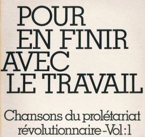 Pour en finir avec le travail. Chansons du prolétariat révolutionnaire. Vol. 1. Disque vinyle 33 tours, titre sur le plat supér. de la pochette. Editions musicales du Grand Soir, 1974. Ce disque a été produit par Jacques Le Glou. On y trouve des chansons révolutionnaires anciennes et des détournements de chansons à la mode, le tout présenté de façon assez facétieuse jusque dans les notices historiques qui accompagnent les textes : nombre de textes sont prétendument anonymes et la musique attribuée au folklore, alors qu'en explorant les choses plus profondément on découvre que les auteurs sont connus et que certaines musiques sont celles de chants connus, comme La Makhnovstchina attribuée à un anonyme ukrainien voire à Nestor Makhno sur une mélodie du « folklore russe », alors que le texte est d'Étienne Roda-Gil et que la mélodie est celle d'un hymne bolchevique. Guy Debord a détourné deux des chansons : La Java des Bons-Enfants (attribuée à un membre de la bande à Bonnot, Raymond Callemin) et Les Journées de mai (attribuées à un membre resté anonyme du groupe Les Amis de Durruti, actif en mai 1937 à Barcelone). Debord est également l'auteur du détournement des neuf notices historiques qui accompagnent les chansons. Les chansons sont interprétées par Jacques Marchais, Vanessa Hachloum, pseudonyme, pour ce disque, de Jacqueline Danno, et Michel Devy.