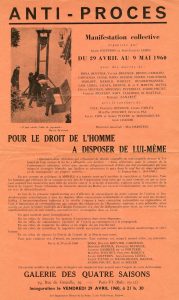 Manifeste "Pour le droit de l'homme à disposer de lui-même" signé par François Dufrêne, Philippe Hiquily, André Pieyre de Mandiargues, Cardenas, René de Solier, etc. Illustration photographique d'une exécution à la guillotine./ IDEM et GABRIEL (Jacques). "Cocteau est malade". Tract surréaliste situé et daté "Paris, le 29 avril 1963" par Gabriel et Lebel, membres fondateurs de Mouvement international pour la Réhabilitation du Bison (M.L.P.L.R.D.B.) : "Nous sommes heureux d'apprendre que la maladie (disease) tenaille Jean Cocteau (...). 1 f. de 21 x 13,5 cm imprimé en noir./ Ens. 2 pièces.