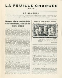 4°, 8 p., en ff. Seul n° paru. Textes de P. Colinet, R. Magritte, M. Mariën, Paul Nougé, L. Scutenaire. Illustré d'un "Portrait des auteurs traité à la Bouchonne" par René Magritte. Dernière manifestation collective du groupe surréaliste belge (Mariën, p. 447-454).