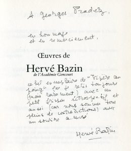 8°, toile ornée édit. Ex. enrichi d'un dessin original en couleurs signé (signature non identifiée). Bel envoi au journaliste belge de radio et de télévision : "A Georges Pradez, en hommage et en remerciement, ce bel exemplaire de "Vipère au poing" que je relis toujours (mais rarement) avec un petit frisson rétrospectif et aussi (car nous sommes tous pleins de contradictions) avec un sourire amusé. Hervé Bazin".