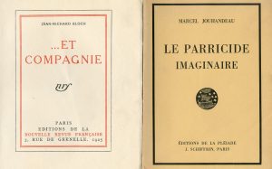 4° tellière, br. Edit. orig. 1/109 ex. réimposés num. sur vergé pur fil Lafuma-Navarre. Ex. de Louis Brun./ JOUHANDEAU (Marcel). Le Parricide imaginaire. P., Edit. de la Pléiade, J. Schiffrin, 1930, 8°, br. (tranches lég. brunies). Edit. orig. Ex. num. sur vélin (celui-ci non num.)./ Ens. 2 vol.