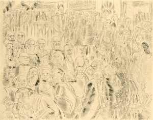 in-folio (425 x 330 mm.), en feuilles, sous portefeuille d'éditeur à rabats fermé par un lien de toile (dos en demi-vélin lég. sali, plats en papier lég. frottés, petite déchirure à un rabat). Orné de 18 eaux-fortes originales en couleurs et de vignettes en noir dans le texte. Edition originale tirée à 140 ex. num. 1/40 Japon impérial contenant les eaux-fortes en deux états : deuxième état en noir et état définitif en coul. (les 3 planches supplémentaires et le dessin original). Chas Laborde illustra Rues et visages de Berlin, avec visiblement beaucoup de plaisir, et beaucoup de 'Schwung'. Des Berlinois, d'avant la Première Guerre mondiale, pleins d'entrain, s'amusent manifestement, dans une ville en fête, qui, à l'époque, formait encore une entité. Des dames et des messieurs distingués, à l'Opéra, sur les terrasses bondées, paradant sur 'Unter den Linden'. Un public tout occupé à faire du shopping, sur la place Potzdammerplatz et dans la rue Friedrichstrasse; ici, la cour intérieure d'un quartier populaire; là, un dimanche dans le parc. Il y a du monde partout, dans les rues, les parcs, à la piscine, et dans les boîtes de nuit. Les filles portent des petits chapeaux et bérets élégants, mais celles qu'on voit dans le 'Casanova', dans les grands magasins de luxe ou le long de la Kurfürstendamm, sont-elles toutes des filles ordinaires? Giraudoux avait bien quelques doutes, car le travestisme et la prostitution foisonnaient à Berlin. De grosses matrones, et des messieurs boursouflés, dandys et snobs, des filles joyeuses et des militaires, font penser à ceux de George Grosz, avec qui Chas Laborde a souvent été comparé. Pourtant, même si Laborde donna souvent une image plutôt réaliste de la vie mondaine dans la grande ville, ses images étaient moins crues et venimeuses que celles de son contemporain allemand.
