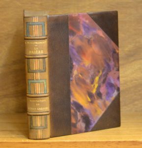 8°, demi-maroquin brun à grands coins, dos à 4 nerfs, motifs géométriques mosaïqués en différents coloris entre les nerfs, auteur, titre, illustrateur et tête dorés, couv. et dos cons. (dos légèrement décoloré) (rel. de Vits). Tiré à 1000 ex. num.1/150 Japon impérial contenant une suite en noir des illustrations.