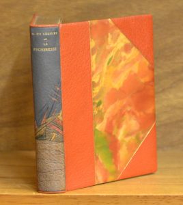 8°, demi-maroquin terre de Sienne à grands coins, dos lisse entièrement orné d'un motif mosaïqué figurant un bateau échoué, auteur, titre et tête dorés, couv. et dos cons. (dos éclairci.) 1/965 ex. num. sur vélin de Rives.