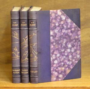 3 vol. in-12, demi-chagrin violet à coins, dos à 4 nerfs, auteur et titre dorés, décor doré de maisons, cheminées d'usines et terrils se prolongeant sur les 3 dos, couv. et dos cons. (dos lég. passés). Edit. orig. 1/100 ex. num. sur vélin supérieur, seul grand papier.