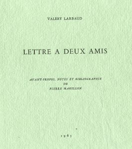 1/30 Arches.- LARBAUD (Valery). Lettre à deux amis. Avant-propos, notes et bibliographie de Pierre Mahillon. Genève, La Revue de Belles Lettres, 1965,