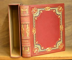 4°, plein maroquin rouge, dos à 4 nerfs plats ornés d'une roulette dorée et d'une petite pastille mosaïquée grise, riche décor doré en long entre les nerfs composé de rinceaux, roulettes, pointillés dorés, filet à froid et bandes verticales mosaïquées de maroquin gris, large décor doré d'encadrement sur les plats composé du même type de fers, 3 filets dorés d'encadrement sur les contreplats avec fleurons dorés, double garde en soie moirée brune et papier marbré, tranches dorées sur témoins, couv. et dos cons., étui bordé de même (dos passé) (reliure de Thierry-Simier). Tiré à 490 ex. num. 1/25 de tête sur Japon impérial enrichi d'une suite en bistre et d'une suite en couleurs avec remarques. Celui-ci enrichi d'un cuivre original serti dans le 1er contreplat, d'un dessin original signé ne figurant pas dans l'illustration du livre et du tirage en coul. de ce dessin. Bel ex. dans un riche reliure décoré dans le style du 18e siècle.