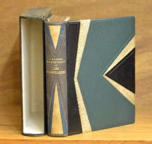 8°, demi-maroquin vert foncé, dos lisse orné de triangles mosaïqués de maroquin bleu et de lézard, plats en chagrin vert ornés d'un décor similaire, tête dorée sur témoins, couv. et dos cons., étui bordé de même (dos passé) (reliure de Vits).