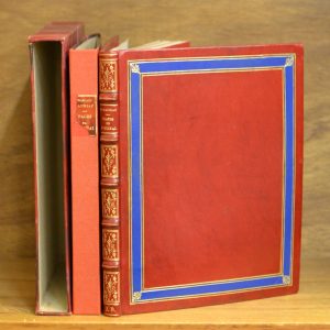 8°, plein chagrin cerise poli, dos à 5 nerfs perlés, caissons fleuronnés, auteur, titre, monogramme du relieur et tête dorés, encadrement sur les plats en basane bleue, fleuronné dans les coins et enceint d'un double filet doré, gardes de velours rouge, couv. et dos cons. chemise et étui cartonnés (rel. incurvée) (reliure de Jacques Brehant). Envoi au relieur. Edit. orig. tirée à 550 ex. num. sur chiffon d'Annonay.