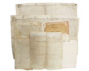de GRESILLES en celui de SAINT SAUVEUR, au lieu de St Honorine de Chardonne + 2 Grands Parchemins de 1559 concernant Jehan GAILLARD Archer en la Garde du château de CAEN et sa famille demeurant à FALAISE + Traité de mariage dans la Vicomté de FALAISE, de Guillaume FRESNEL Sieur de Saint Germain, 1607 + Expéditions d’actes de 1765, 1672, 1680, concernant « Messire Claude Nicolas de SAINT SAUVEUR, chevalier, Baron dudit Lieu, Seigneur et patron de SAINTE HONORINE LA CHARDONNE et autres lieux » & Documents militaires de « Claude Nicolas Michel de SAINT SAUVEUR, Cornette de la Compagnie des Dragons » - Officier de cavalerie, décédé à VERVIERS en pays de Liège en 1792 ; Brevets militaires 1733, 1740 et 1772, certificat d’amnistie signé FRANCHET D’ESPEREY le conseiller d’Etat, Paris 1826 – Documents concernant DESPREAUX DE SAINT SAUVEUR propriétaire à Equenoy près Breteuil (Oise) Lettres, Expédition du Directoire du district de DOMFRONT, 1793 ; Extrait de naissance, petit inventaire, Imprimé sur l’Histoire de St Honorine de Chardonne (défaut), & Divers – L’ensemble :