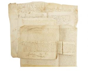 (Les pièces qui parlent des droits de FOURCHES PATIBULAIRES sont très rares. Les fourches patibulaires, appareils d’exécution des Seigneurs Haut-justiciers où l’on suspendaient les criminels, qu’on y laissait pourrir et dévorer par les oiseaux de proie. Ces Potences était souvent situées à l’entrée des Seigneuries comme avertissement. les plus connues étaient celles de la Prévôté de Paris à Montfaucon. le nombre de piliers variait selon la qualité des Seigneurs. Toutes ont disparu à la Révolution. Les documents qui en parlent aussi.) - 19 Parchemins et papiers de 1514 à 1737, savoir : Sentence touchant la paierie et ferme des amendes de la Seigneurie de Rosoy 1514 (32 x 51 cm) + Sentence du Bailli de Château-Thierry qui permet de relever les Fourches Patibulaires de Rosoy 28 Avril 1515. (35 x 52 cm) + Sentence d’entérinement des lettres patentes de François 1er au sujet des Fourches Patibulaires (19 et 28 avril 1515). + Contrat de vente de la terre et seigneurie de Rosoy 1529 + Sentence de commutation de peine du Bailli de Château-Thierry contre deux délinquants de Rosoy, 1529 + Bail de la Ferme des défauts, exploit et amendes de la Seigneurie de Rosoy 1544 + Prise de possession de maison et héritages en la Seigneurie de Vieux Maisons 1553 + Lettres patentes de Charles IX qui commet Mr le Bailli de Château-Thierry pour faire relever les Fourches Patibulaires de Rosoy. 1571 + Sentence d’entérinement des lettres patentes du roi Charles IX au sujet des Fourches Patibulaires 23 Mai 1576 + Procès verbal fait par le Juge de Rosoy à l’encontre de certains particuliers qui avaient fortifier leurs Maison en l’étendue de la Haute, moyenne et basse Justice de la seigneurie de Rosoy 1579. (33 x 42 cm) + Sentence au sujet du Droit de Talonnage et Afforage.1581. + Sentence qui condamne Robert Arnault à l’amende pour avoir vendu et percé ses tonneaux sans avoir appelé l’Officier suivant le droit de la Seigneurie de Rosoy. 1581 + Sentence du juge de Rosoy au sujet de l’étalonnage des mesures de vin et autres choses qui se vendent en la seigneurie 1633 + Demande en maintenue des droits honorifiques en l’église de Rosoy 1732, etc. + un Dossier plus récent de lettres et pièces concernant le Comte de LAVAUX (ou LA VAULX), au Château de ROSOY BELLEVALE – L’ensemble