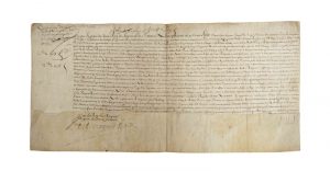 – Confirmation d’érection de Fief du consentement du Seigneur en conséquence d’échange. Janvier 1646 – «…Georges De LIMOGES et les habitants des villages de PERRIERS, RENNEVILLE, PRENEL et autres prétendraient aux terres vaines pâtures et communs Fieffés par les Abbé Prieur Religieux de l’Abbaye de Saint Ouen de ROUEN comme à eux appartenant et dépendant de leur Baronnie de PERRIERS SUR ANDELLE (27), pour terminer les procès… » - Parchemin (58 x 28 cm)