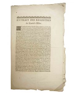 Il est a noté un Tarif spécial « Pour les JUIFS, 3 Sols », et Double Tarif « Pour toutes JUIVES ENCEINTE, 6 Sols. LES SARRAZINS payeront le même droit… » – « Extrait des Registres du Conseil d’Estat. » Imprimé 3pp in-folio. Suivi de notes manuscrites