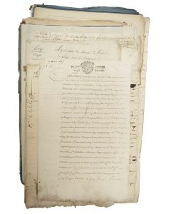 AISNE – COLLECTION DE 35 PIÈCES SUR LE DÉPARTEMENT DE L’AISNE – Principalement des Expéditions notariées XVIIIe s., XIXe s. concernant : Noble Homme Michel MARQUETTE conseiller du Roy, Président au Grenier à Sel de LAON et son frère,...