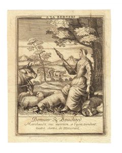 LYON - PUBLICITÉ XVIIIe S. « À LA BERGÈRE » BOUVIER ET BOUCHARD, marchands rue Mercière à LYON, vendent toutes sortent de Merceries. (20,8 x 16,3) – les publicités éphémères de cette époque sont très rares