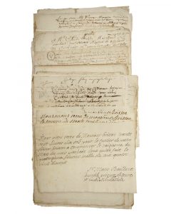 dont : Reçu pour la Visitation de MOULINS (Signature de Sœur L.H. de SOURDEILLES, Supérieure, 1683 + Reçus pour le Couvent des Minimes de MOULINS (1693-1706) + une vingtaine de reçus signés de la Prieure d’YZEURE (1695-1706) + Extraits des novelles appartenant au Prieur de VOUSSAC, à CHIRAT.) – l’ensemble