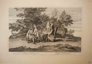 Des coupes et bouteilles ainsi que six vers du poète Gascon au bas de la gravure suggèrent d'autres divertissements... « Dans les beaux jours du printemps (...) Les belles avec leurs galants, Font très souvent la bête à l'ombre. » -