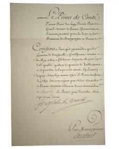 CHÂTEAU DE CHANTILLY (OISE) – Pièce signée “HENRY JULES DE BOURBON” Prince de CONDÉ, Premier Prince de Sang, Premier Pair et Grand Maître de France, Gouverneur et Lieutenant Général pour le Roy en ses Provinces de Bourgogne et Bresse -...