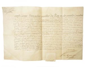 P.S. à son entête « Joseph CAMUS DESTOUCHES, conseiller du Roy, Contrôleur général de l’Artillerie de France – Parchemin (33 x 51) – État A -