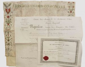 Diplôme d’Avocat en la Cour de BESANÇON, 1717, avec sceau de cire dans sa boite de métal ; Parchemin enluminé (43 x 55) + Commission de l’Office d’Assesseur de la Judicature de ST CLAUDE du 30 déc. 1740. P.S. par le Roy, PHELYPEAUX - Parchemin (28 x 49) + 5 Diplômes de l’Université de BESANÇON (3 enluminés) de 1717 1765, 1775 (défauts, trous et déchirures) + Certificat de la Garde Nationale de Besançon pour le citoyen Joseph célestin NICOD homme de Loi, 1793 + Décret Impérial signé Charles Maurice TALLEYRAND et MONTALIVET, pour la Présidence du canton de ST CLAUDE (52 x 41 ; qq. trous) + Brevet gravé de la Légion d’Honneur signée du Maréchal MACDONALD (45 x 36) + Diplôme de Membre de la société d’émulation du département du JURA. Lons-le-Saunier 1837. P.S. CHEVILLARD Président + Diplôme de Membre associé correspondant de l’Académie des sciences, Belles lettres et Arts de BESANÇON. 1823 + Profession de foi d’élection, Polices d’assurances (belles vignettes), Lettre d’invitation du Roi Louis XVIII. 1826 + Affiche politique de BAVOUX Conseiller Général pour les Elections Législatives du 21 août 1881, qui s’adresse aux Électeurs de Saint-Claude. –