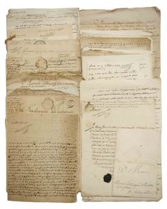 Plus de 60 lettres et documents de 1722 à 1772 - Correspondance, Expéditions notariés, papiers de familles le concernant, Mémoire à consulter ; Succession de sa tante Mme de KERNEOUER, morte chez les Dames religieuses de LANDERNAU (Finistère), etc. –