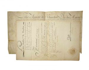 FAMILLE DE BOURBON – 2 pièces Pièce Signée « Louis auguste de BOURBON », Duc du MAINE, Prince légitime de France, Prince souverain de Dombes, Comte d’Eu, Duc D’Aumale, Colonel Général des Suisses et Grisons, Gouverneur et Lieutenant...