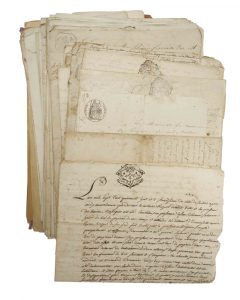 (AUDE) – Famille SABATTIÉ Habitant à PEYRIAC DE MER (11) – Ensemble de plus de 100 papiers notariés concernant cette Famille (quelques parchemins), majorité du XVIIIe, XIXe Siècle. Certains sont timbrés de la Généralité de Montpellier....