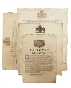 1°) François Nicolas FERRARIS, Seigneur de la Tour d’ISOLA, Intendant général de Justice, Police & finances pour S. M. deçà les Monts ; PEYRANI Sénateur au sénat de SAVOYE et LOUERA… - Fait à CHAMBÉRY le 12 Août 1750 – au sujet de la « vérification des Comptes d’Administration publique en Savoie pendant le dernière Guerre. » - (59 x 48) + 2°) – « CHARLES EMMANUEL Roi de Sardaigne, de Chypre & de Jérusalem, duc de SAVOIE, de Montferrat, d’Aoste, de Chablais, de Genevoix & de Plaisance, Prince de Piémont » – Ordonnance contre les Soldats déserteurs, donnée à TURIN le 6 sept. 1767. (116 x 55 cm; Impr. à TURIN de l’Imprimerie Royale) + 3°) « LE SÉNAT DE SAVOYE. » - Fait à CHAMBÉRY, au Séant, le 18 décembre 1773 – Ordonnance qui fixe les taux d’intérêt dans toute l’étendue du Duché de Savoie. (45 x 32) + 4°) - (SAVOIE) – « la Chambre des Comptes de Sa Majesté. (CHARLES EMMANUEL) » Turin 1776 . sur les « Droits d’émolument, dus aux royales finances. ». (50 x 42) -