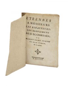 1752 - (COLPORTAGE) – Jean Joseph VADÉ – « Étrennes à Messieurs les RIBAUDEURS : les suppléments aux Ecosseuses ou Margot la mal-peignée en belle humeur & ses qualités » - s. l., 1752.