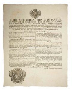 (Entête à ses nom et titres « Charles DE ROHAN, prince de SOUBISE, d’Epinoy et de Maubuisson Duc de Rohan-Rohan, Pair et Maréchal de France, ministre d’Etat,… ») – en 7 articles – « Rien n’étant plus important pour le Service de l’armée & pour la facilité de ses opérations que la conservation & le bon emploi des VOITURES destinées au transport de ses subsistances & de ses approvisionnements en tout genre… » - Vignette aux armes et Lettrine -