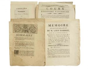 Mémoire de procès «Sommaire pour le Comte et la comtesse de CARVOISIN, le marquis et la Marquise DESCARS DE PERRUSSE contre Dame DUPERCHE, épouse séparée de GUIBALD DE SALVERT, Grand Prévôt de la Maréchaussée de POITOU…, et contre le Sieur DUBOIS DE SANZAY ; De l’imprimerie de KNAPEN, 1765 (26pp in-4°) + « Mémoire justificatif de M. Louis BARBIER, Maire de ST-ROMANS-LES-MELLE, suspendu de ses fonctions par arrêté du préfet des Deux-Sèvres le 8 frimaire An 14… » (11pp in-4°) - « Réponse de AUDRY DE PUYRAVEAU à Messieurs BRANGER ET PERREAU (de Fontenay) ; 15pp in-4° - 2 lettres impr. au Electeurs du Canton de MELLE – Prospectus pour le Cours d’Histoire naturelle de l’École centrale du Département des Deux-Sèvres, de l’an 7 ; Impr. à Niort, chez P. Elies (1pp in-4°) + Journal « L’Écho de MELLE, journal de l’arrondissement du 22 Oct. 1843 + Prospectus pour « L’Observateur Évangélique… », impr. Poitiers + « Almanach de l’Agriculteur du POITOU pour 1888 » (64pp in-8°) + « Almanach du Bon Agriculteur des Deux-Sèvres pour 1905 » + 4 journaux imprimés à Niort: « Revue de L’ouest », du 18 avril 1840 et 24 avril 1848 ; « Mémorial des Deux-Sèvres. » 1892 ; « L’Union MELLOISE » 1902 -