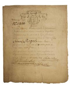 (SOIE DE LYON en 1773) – « LETTRE DE MAÎTRISE DES OUVRIERS EN SOIE » pour Henry REGNÉ, Compagnon de LYON (69). Fait au bureau à LYON le 27 Octobre 1773.