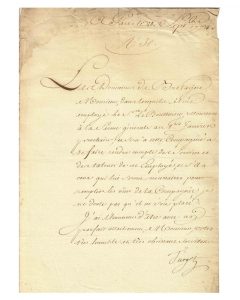 1p in-folio – « Les Domaines de Bretagne, Monsieur, dans lesquels était employé le Sieur LE BOULOING, retournent à la Ferme générale au 1er Janvier prochain ; ce sera à cette Compagnie à se faire rendre compte des services et des talents de cet Employé, et s’il a ceux qui lui seront nécessaires pour remplir les vues de la compagnie, je ne doute pas qu’il ne soit placé… » - 1p (30 x 21) -