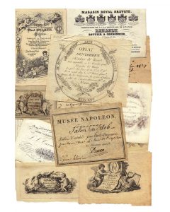 « RICCI Dentiste breveté du Roy, OPIAT Dentifrice » (XVIIIe S.) + Billet d’entrée au « MUSÉE NAPOLÉON », Salon de 1806 + « Poids de la ville d’ANGERS 1827 » + Billet de tour de garde, 1821 + Bains Ste Anne + RENAULT Bottier et cordonnier à Paris + CUENIN & fils, armement pour l’inde et la chine, à Dunkerque + OBLIN Graveur, etc.