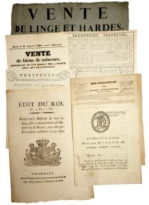 DOCUMENTS DIVERS – 19 pièces imprimées - Edit du Roi de Sardaigne de 1788 « qui défend les jeux de hasards et de renvi. » + Affiche timbré de vente de Linges et Hardes. 670 Rue Helvétius, au coin de la rue neuve des petits champs, le 2 germinal an 10 + Lettre Maçonnique de l’Ordre D’AIX-EN-PROVENCE .....
