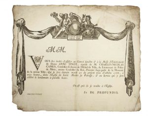 « Vous êtes invités d’assister au convoi funèbre & à la Messe d’Enterrement de Dame Anne TINOT, épouse de M. Charles-Nicolas CAMUS, Conseiller-Échevin de l’Hôtel de ville, & Lieutenant de Police de METZ, Ancien Conseiller du Roi, Premier Juge-garde de la Monnaie de la même ville ; qui se fera demain mardi 21 Octobre 1788, dans l’Église de Saint Martin sa Paroisse… » - Décors macabre - État B –