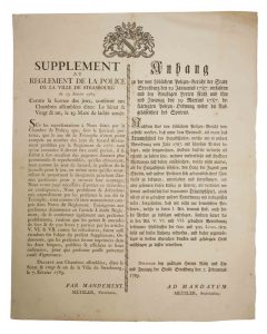 « Supplément au règlement de la Police de la ville de STRASBOURG du 29 janvier 1787 ». Placard in-folio aux armes de la ville portant sur 2 colonnes, l'une en français, l'autre en alsacien, un supplément au règlement concernant le jeu de la Triomphe -