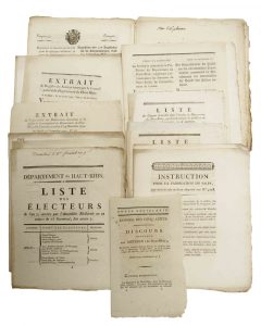 Extrait des délibérations du Haut-Rhin du 29 Novembre 1791, sur la fausse nouvelle de la Fuite du Roi (Louis XVI). + Extrait COLMAR 24 Août 1792 + Adresse de l’agent National de COLMAR + «Extrait du 20 avril 1793 qui concerne l’arrestation de Étrangers Russes + 3ème Liste contenant les Noms de 200 citoyens du Haut-Rhin pour former le Juré de l’année 1792 + Extrait des arrêtés du Comité de Salut Public du 9 Prairial An 2 + Liste des citoyens du district de COLMAR pour les Jurés d’accusation An 2 + « Instruction pour la Fabrication du Salin », donnée par les Membres du Comité de Salut Public, dont Robespierre (1794) + « Liste des Électeurs de l’An 7, arrêtée par l’Assemblée Électorale le 23 Germinal An 7 » + Liste des Jurés de l’An 7 + Réquisition de 600 chevaux de trait pour les équipages militaires 1813 + Services des Subsistances de l’armée. Strasbourg 1813 + Reprise de l’administration par les autorités françaises. 14 Mai 1814 + Discours du Lieutenant-Général Baron de PUTHOD, Président du Collège Electoral du Haut-Rhin du 16 Mai 1822 + etc.. -