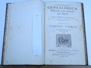 [ELZEVIER]  EMIUS (Ubbo) Appendix genealogica illustrando operi chronologico adjecta ad eunden nobilifsimum & amplifsimum virum. 1 vol. in-folio allongé de 167 pp. + pages blanches reliure plein cuir, dos à nerfs à caissons fleuris, tranches...