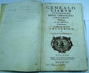 [GENEALOGIE]  RITTERSHUSIO (Nicolas) Genealogiarum præcipuorum orbis Christiani procerum... 1 vol. in-folio allongé relié plein vélin souple. Tubingæ Philiberti Brunnii 1658. Avec 28 tableaux généalogiques sur double page, la plupart...
