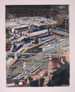 [PERON] MAC ORLAN (Pierre) Brest. Orné de 54 compositions en couleurs de Pierre Péron dont 20 aquarelles, 16 bandeaux & 16 culs-de-lampe. 1 vol. in-folio en ff. broché, couverture imprimée rempliée. La Baule Ed. de Bretagne 1946. Tiré à 900...
