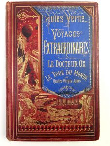 VERNE JULES , Voyages extraordinaires , Le docteur Ox et le tour du monde en 80 jours , édition Hetzel , 1874 , in-4 Illustré par Bertrand , Bayard , Marie , Schuler et Froelich. Nombreuses rousseurs , le dos est lâche. Reliure d’éditeur en...