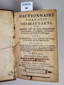 LACOMBE , Dictionnaire portatif des beaux arts ou abrégé de ce qui concerne l’architecture , la sculpture , la peinture , la gravure , la poésie et la musique , édition Estienne , Paris , 1753 , in-12 Reliure plein veau d’époque , dos lisse...